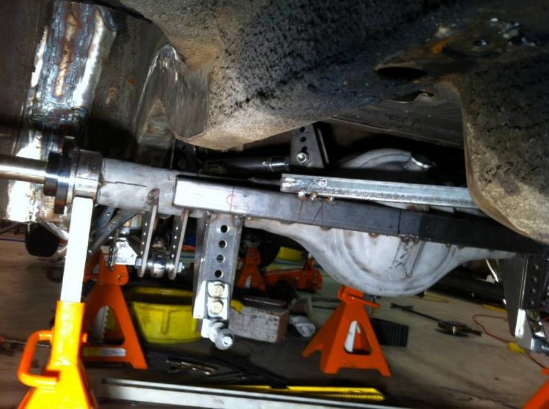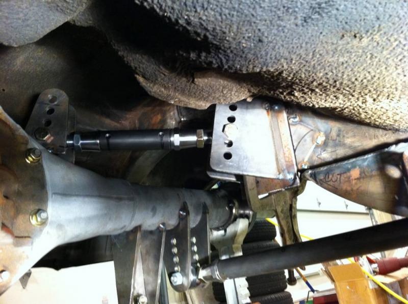 I quit the ladder bar theory awhile ago. It will have enough travel to top out the shock and bottom it out. It will be on about 1" of compression at ride height. I can adjust the height of the car with the shock brackets and there is plenty of adjustment for Instant Center cause I made a whole bunch of combinations with all the holes in the brackets. The adjustments are kind of like a standard 4 link but triangulated.