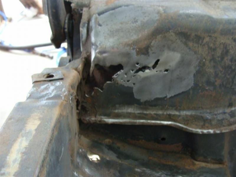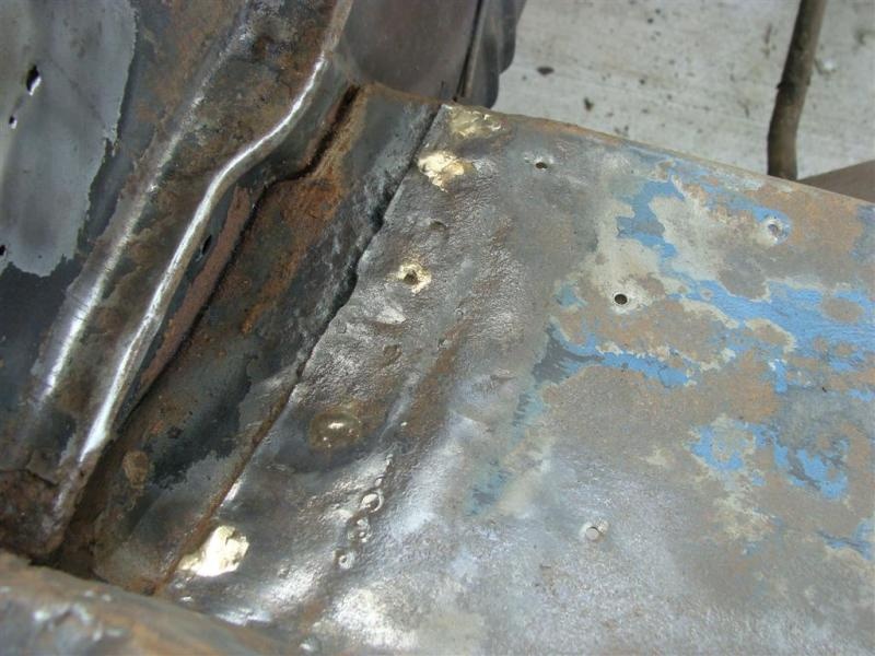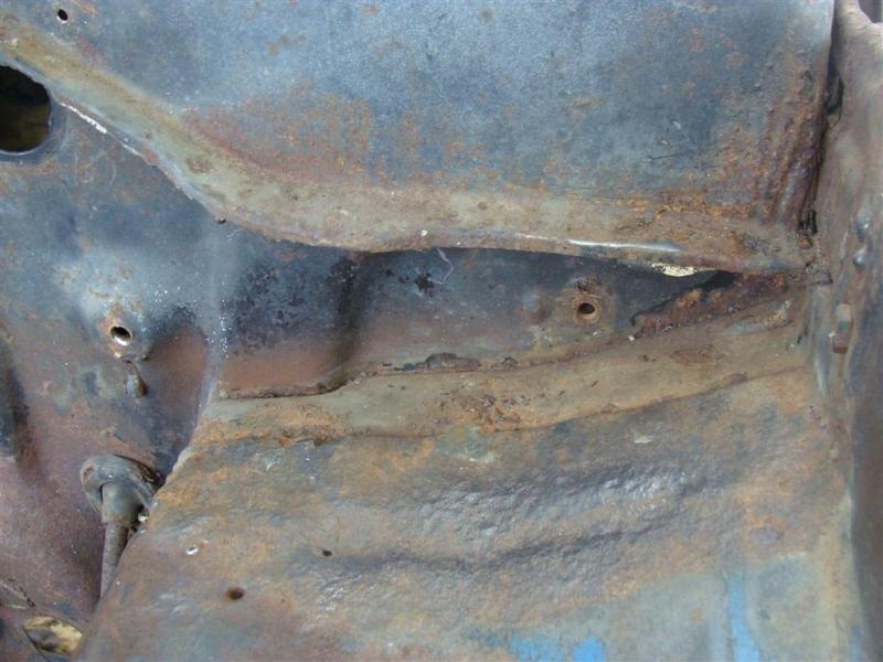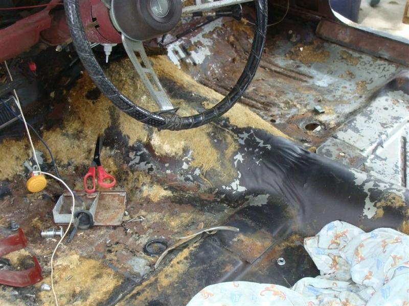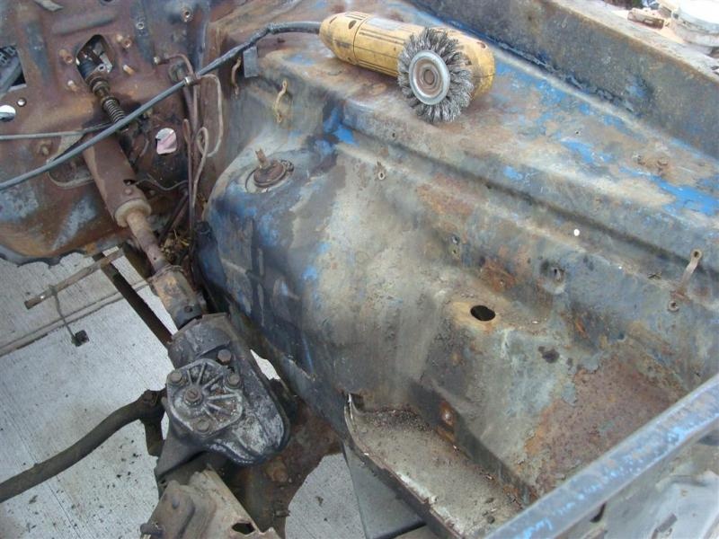 Like mullinax said, the offset grinder and twisted wire wheel is probably the best tool for the first wack. Just make sure that you address the rust before you paing over it or all that work will be for naught. Yes is looks like some of the plug welds were brazed in. Is that the horn button or the starter button laying on the floor? Now that is high tech!!! L8r
