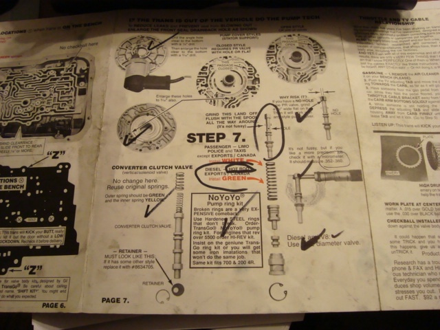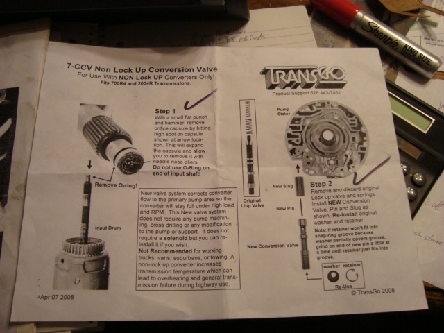 Well finally some progress. Here are some pics of the SysKoKit (Shift kit,SK200-4R-B) used on my 2004R and the Transgo non lock up kit and the Gil Younger Reverse fix. The guys at TransPartsWarehouse checked off everything they did (on this work sheet) as they overhauled the 2004R. Then they put it on their half million dollar dyno and tested it to make sure everything worked properly. I really like the fact that they have already ran the tranny (under load) to ensure everything works properly, all the pressures are correct and that it shift as advertised. I should be able to pick the tranny up in a few days. Too many mods to list but you can see in the pics all the things they did. Will list all the new parts installed in a few days.