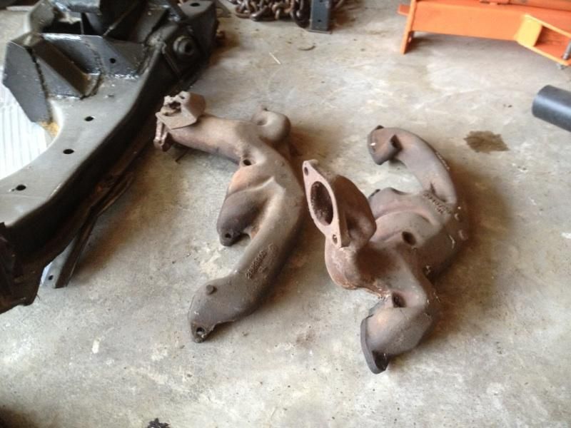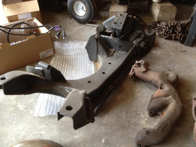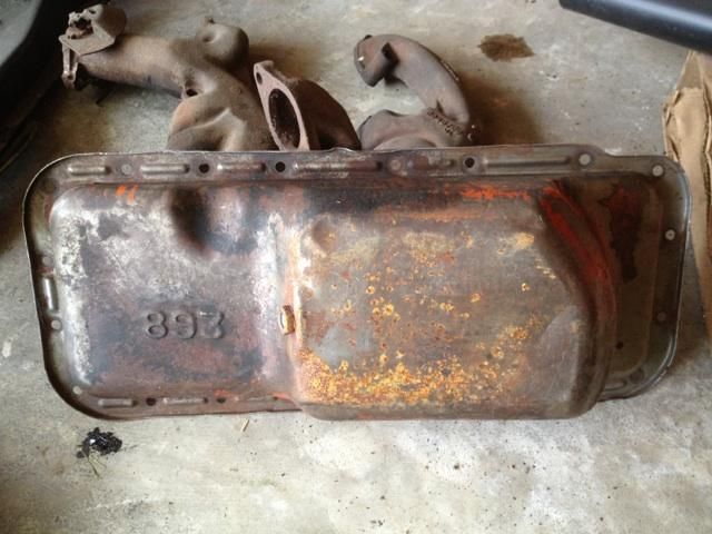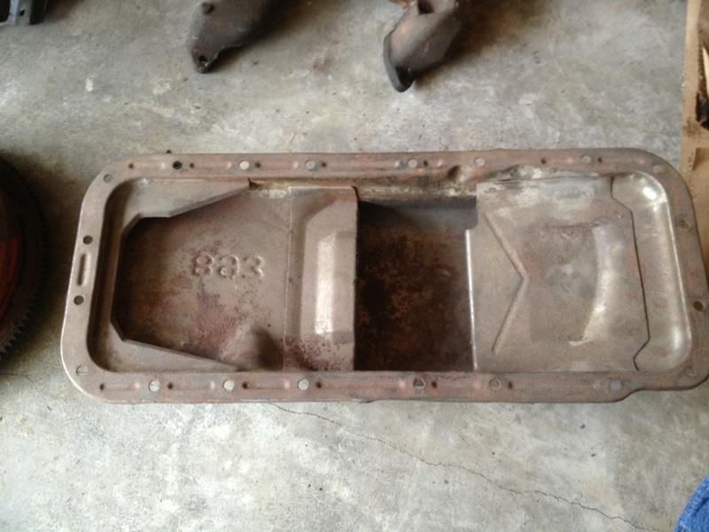He has found the carter carburetor, motor mounts, exhaust manifolds, oil pan, K-frame, torque convertor(possibly the transmission), and the bare block with caps.