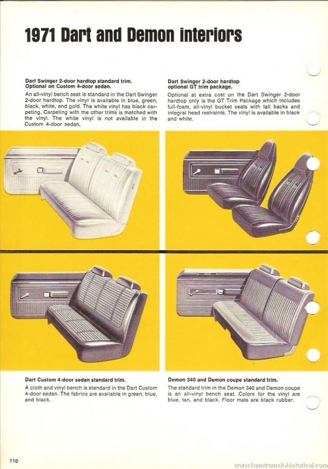 I've got a '71 Dart GT. 318, 2-bbl, A-904 (console shifted), Bucket seats, A/C, PS, Rimblow, a 3.23:1 Sure-Grip 8 3/4" rear-end, GY8 gold, and black vinyl top/interior all from the factory.
