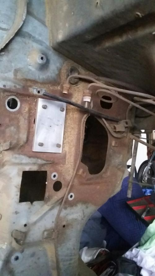 This car came from CA on casters and It's kind of nice having a parts car in the driveway to rob everything from. I robbed the front suspension from it,added the 73-up k frame,v8 bars,rolling rear axle,a/c box assy,battery tray,horns,front grille set up,gas pedal,DS door hinges so the door opens,wiper motor,switched out the splash shield,added manual box,column,tons of misc bolts/screws/nuts that were missing. The parts came from this green 67 Signet that I still need to finish cutting up.It don't look like that no mo either :P